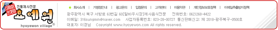 효예원은 귀하의 개인정보보호를 매우 중요시하며, 『정보통신망이용촉진등에관한법률』상의 개인정보보호 규정 및 정보통신부가 제정한 『개인정보보호지침』을 준수하고 있습니다.